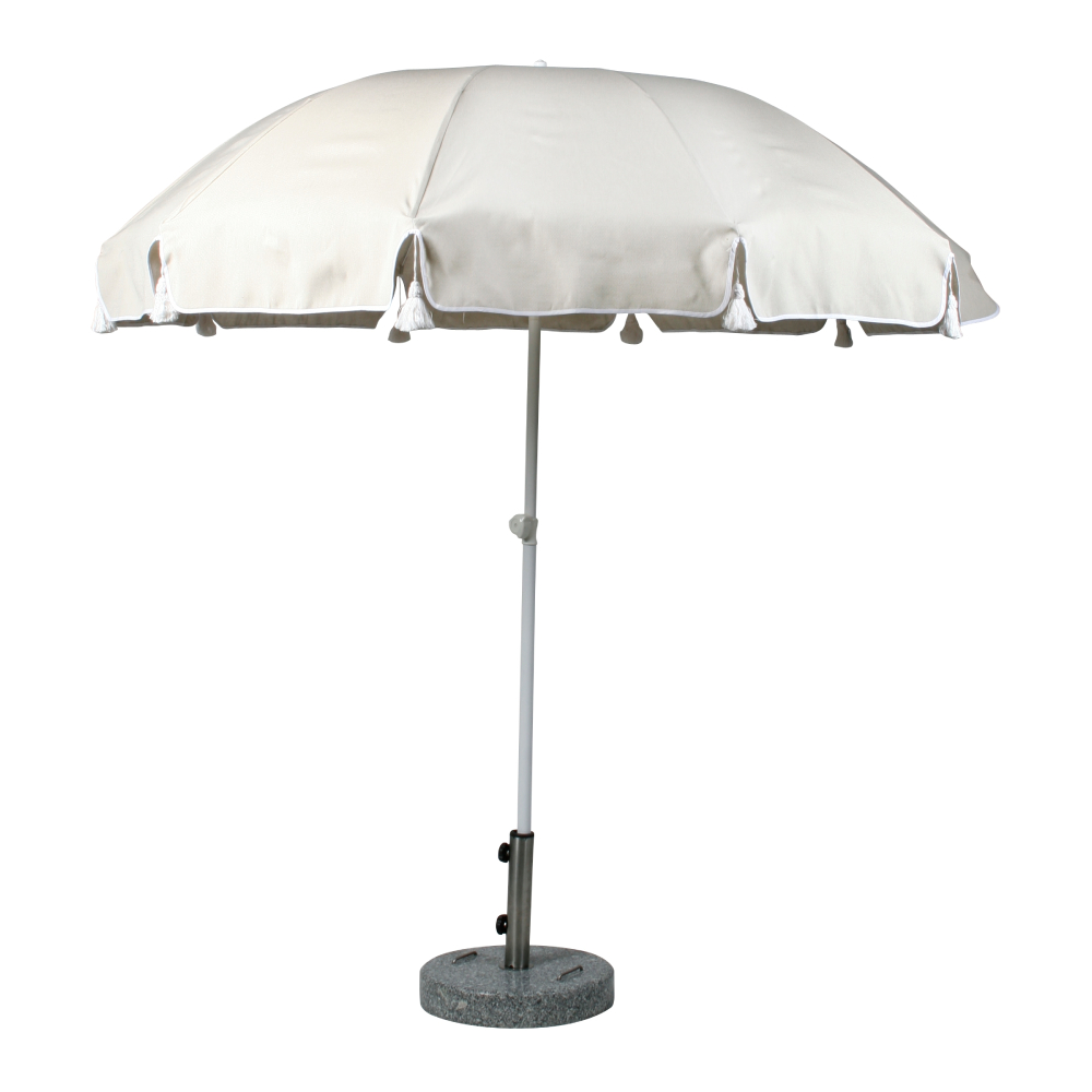 Fri Form parasoll i beige med mindre dekorativa tofsar är designad av Elsa Stackelberg. Parasollet är tillverkad i slitstarkt dralontyg med högsta möjliga solfasthet, är vatten och smutsavvisande och har ett vitlackat stålstativ. Den klassiska designen gör att det passar olika typer av utemöbler.
