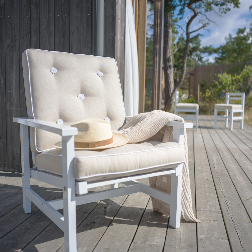 Fåtöljen i vit aluminium från Fri Form är en riktig klassiker formgiven av Elsa Stackelberg. Designen är stram och stilren, rensad från onödiga detaljer vilket är karaktäristiskt för varumärkets kollektion. Det återhållsamma formspråket gör att designen står sig år efter år och har blivit en svensk klassiker som har en given plats i designhistorien. Fåtöljen har armstöd, en justerbar rygg och svagt nedåtlutande sittyta vilket ger högsta möjliga sittkomfort. Till fåtöljen finns en mängd olika väl avstämda färger på dynor att köpa till. Dynorna är tjocka och försedda med paspoal och broderat emblem Fri Form. I serien finns soffor, soffbord, solsängar, serveringsvagnar hammock och dynbox. För att göra valfriheten större finns samtliga av Fri Forms möbler att beställa i furu, teak och flera färger underhållsfri aluminium.