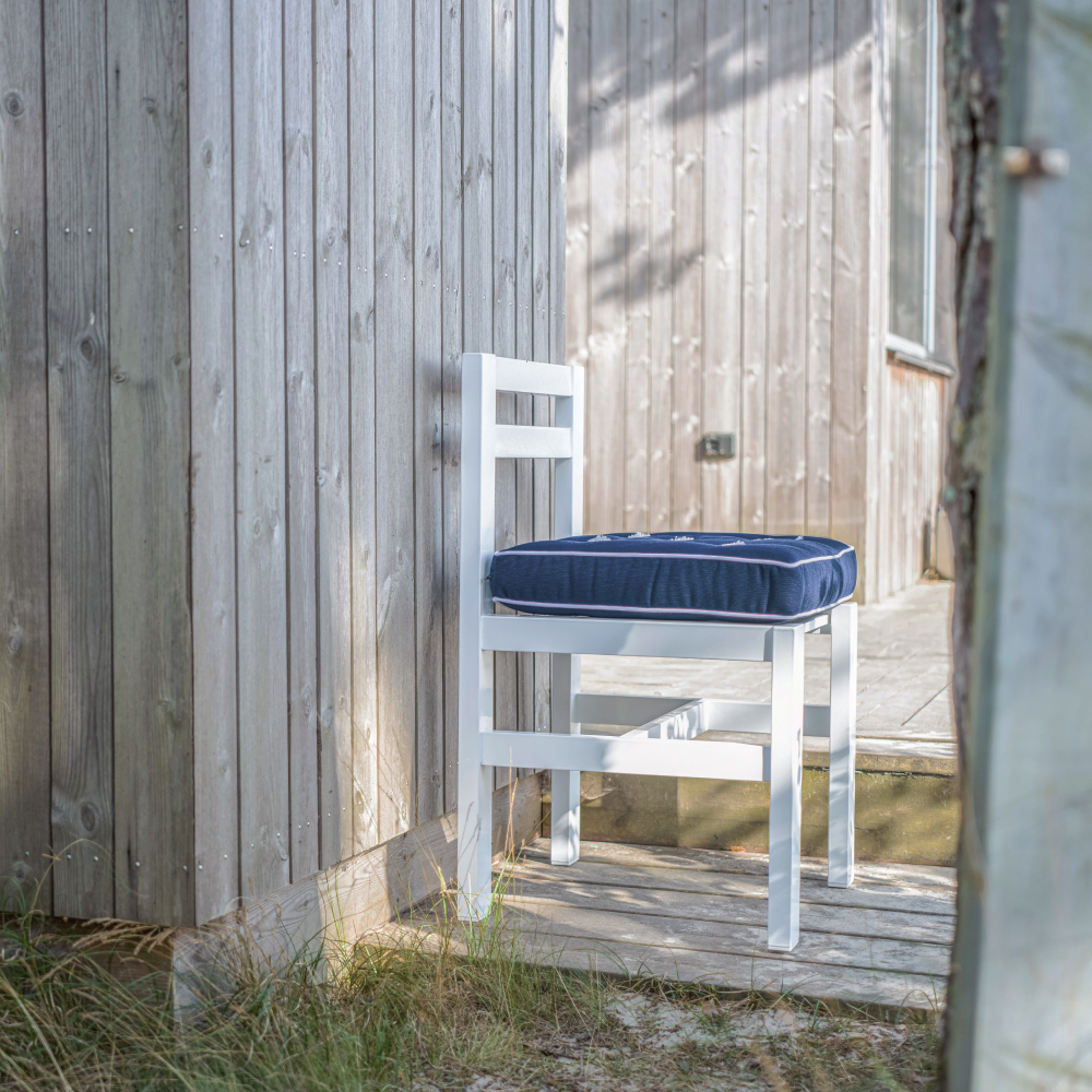 Stol i vit aluminium från Fri Form är en riktig klassiker formgiven av Elsa Stackelberg. Designen är stram och stilren, rensad från onödiga detaljer vilket är karaktäristiskt för varumärkets kollektion. Det återhållsamma formspråket gör att designen står sig år efter år och har blivit en svensk klassiker som har en given plats i designhistorien. Till stolen finns en mängd olika väl avstämda färger på dynor att köpa till. Dynorna är tjocka och försedda med paspoal och broderat emblem Fri Form. I serien finns soffor, soffbord, solsängar, serveringsvagnar hammock och dynbox. För att göra valfriheten större finns samtliga av Fri Forms möbler att beställa i furu, teak och flera färger underhållsfri aluminium.