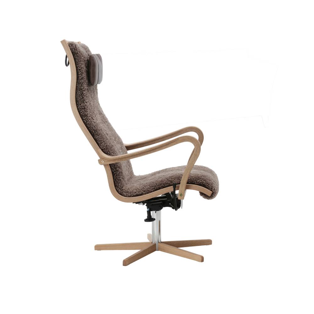 För att höja komforten ytterligare ingår en matchande nackkudde i priset samt gungfunktion. Fåtöljen kan beställas med eller utan fotpall i en mängd olika tyger och läder. Som standard leverans med snurrfot med trä med möjlighet att välja metallfot i krom eller svart.